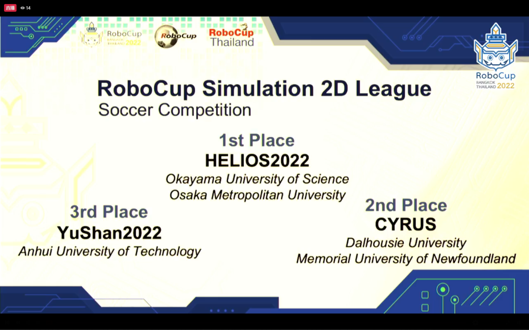 7月13日至17日,第二十六届机器人世界杯RoboCup2022在泰国曼谷市举行。BG大游平台程泽凯老师指导,任亚辉、汤曜坤、卢毅榕等同学参加的YuShan机器人足球队在线参加仿真2D组比赛。YuShan队克服困难,不畏强手,一路拼搏,最终蝉联季军的优异成绩,站上领奖台,日本冈山理科大学/大阪公立大学Helios队和加拿大达尔豪斯大学Cyrus队分获冠亚军。本届比赛吸引了45个国家,400余支队伍,3000多人参加。