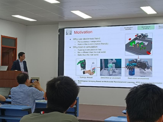 梁洪濯表达了自己对母校BG大游官方网站及本硕期间导师的感恩,就自己在德国汉堡大学实验室中所做的机器人相关研究进行了系统介绍,分别介绍了机器人的发展现状、机器人拿取物体的原理、强化学习及深度学习在机器人拿取动作中的应用及实际视频展示。他表示机器人是一个值得研究的领域,鼓励员工们投入更多兴趣对此进行研究。
