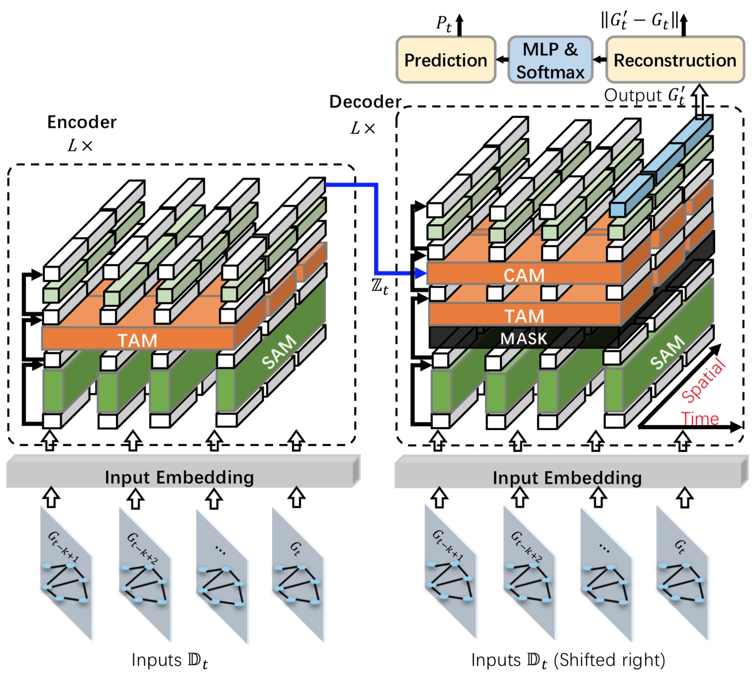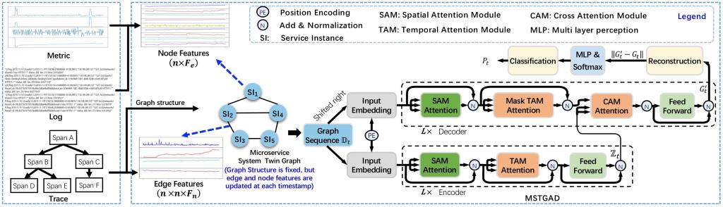团队提出了基于微服务系统孪生图的多模态异常检测模型,通过微服务调用关系构建微服务系统孪生图MST Graph,将指标、日志和调用链信息分别嵌入到图中的节点和边,实现对三种模态数据进行融合学习。基于Transformer架构,提出了包含时空注意力模块的异常检测网络,设计了一个基于半监督的损失函数,促使模型有效地学习标签数据和未标签数据。在两个数据集的对比实验验证模型具有较好的异常检测性能,以及对不同数据模态之间的相关性和数据模态的时间依赖性建模可以有效提升异常检测的性能。本研究具有重要理论研究意义和实际应用价值,为微服务系统异常检测提供了一种崭新的思路,将引领微服务系统异常检测关键技术的发展。