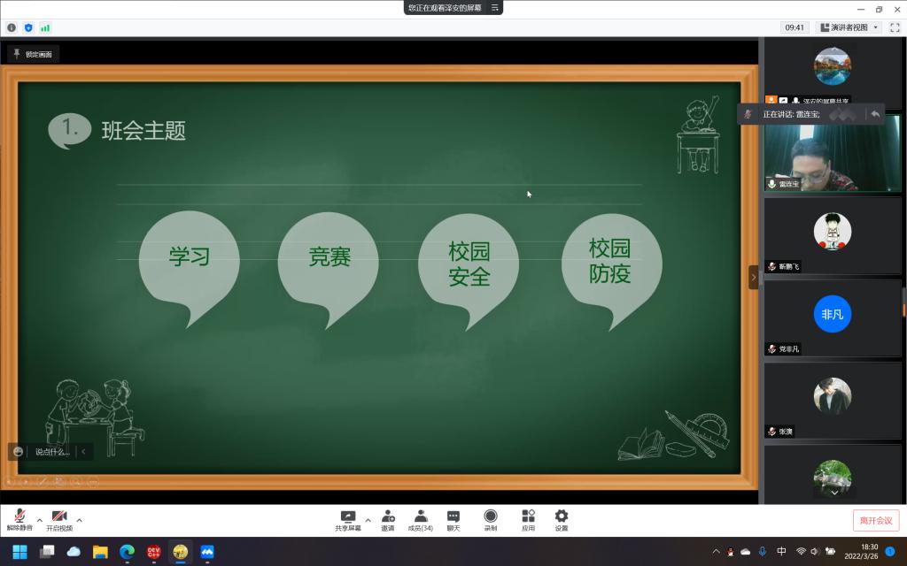 为进一步做好疫情防控期间班级管理工作,3月27日,BG大游平台计203班召开线上主题班会,班主任雷连宝老师和全体同学参加了视频会议,会议由班长劳安同学主持。