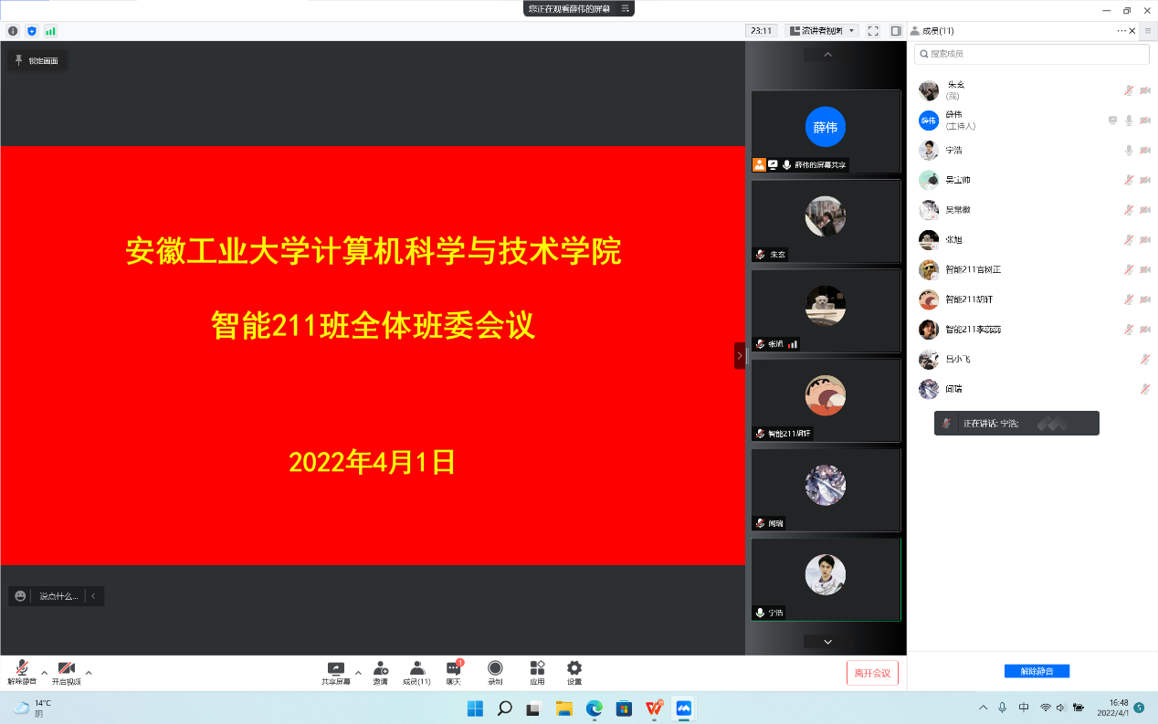 4月1日下午,BG大游平台智能211班级通过腾讯会议召开了班委工作会议。此次会议由班主任薛伟老师主持,智能211班全体班委参加。