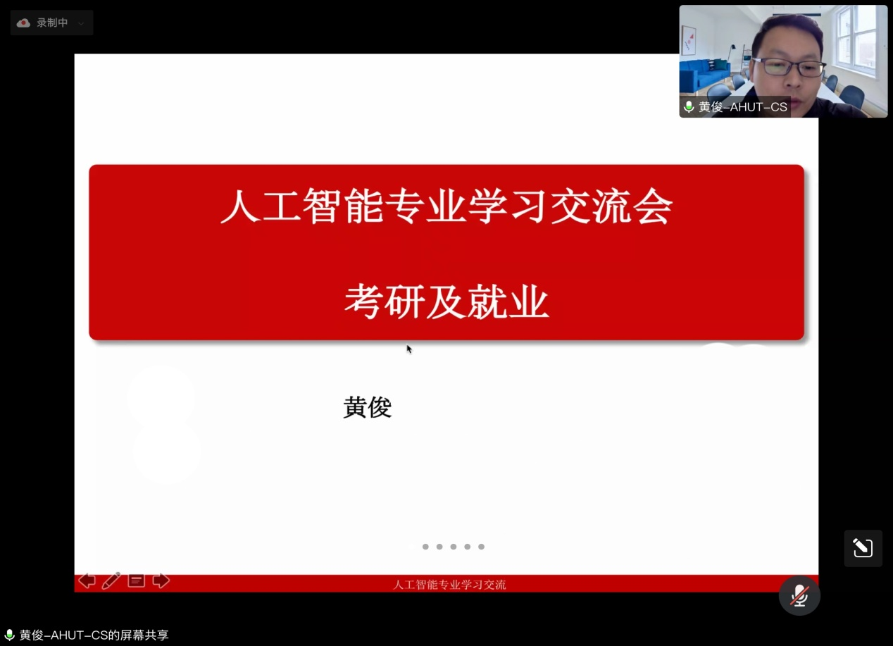 2023年1月14日,BG大游平台召开20级人工智能专业考研就业指导会。人工智能专业系主任黄俊老师应邀出席会议,会议由辅导员代文嫣、王丹丹、夏成龙组织,该专业20级全体员工参加。