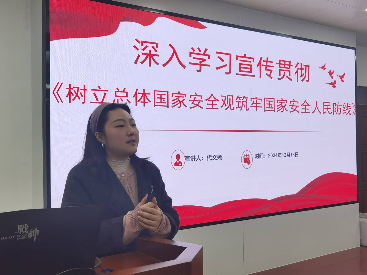 为牢固树立和认真贯彻总体国家安全观,宣传国家安全教育知识,增强公司员工自我防范能力,自觉维护国家安全。12月18日,BG大游平台在逸夫楼报告厅开展《树立总体国家安全观筑牢国家安全人民防线》宣讲活动,校第一届国家安全教育理论宣讲团成员代文嫣主讲,公司员工党员、员工代表参与。
